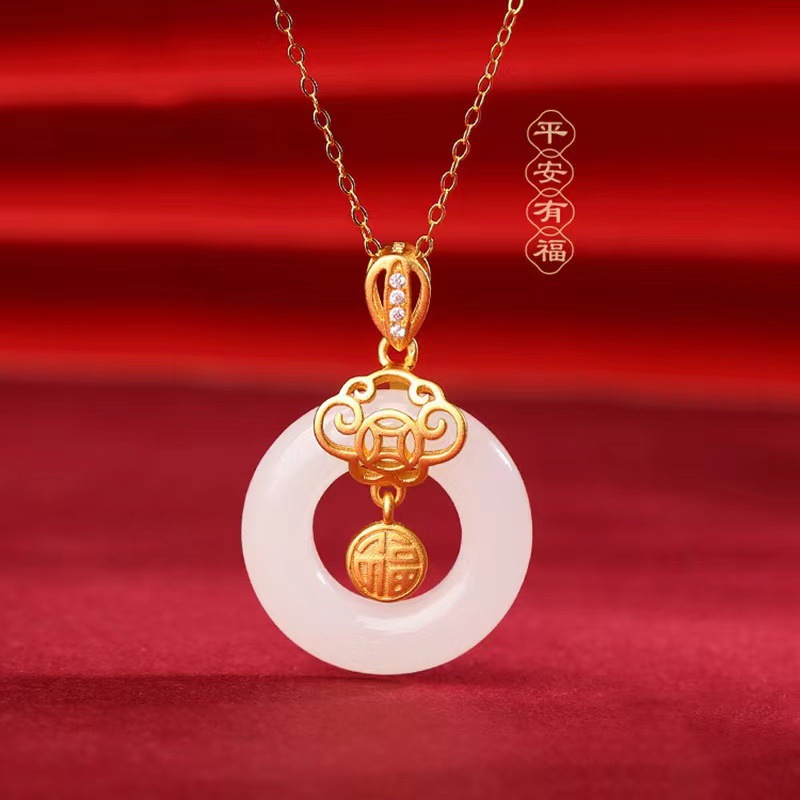 Fu brand Hetian jade safety buckle necklace female silver-plated niche design high-grade clavicle chain holiday gift for girlfriend