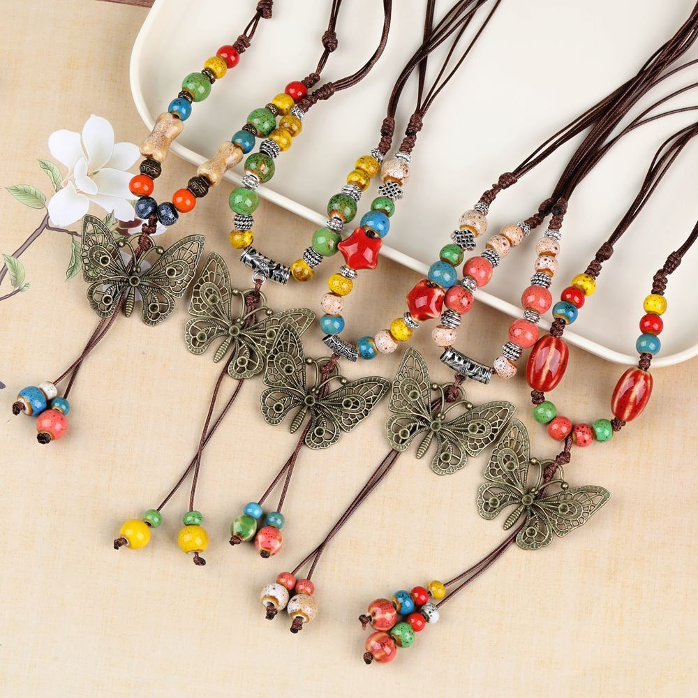 Ethnic Style Ceramic Flower Glaze Beads with Long Necklace Retro Bohemian Copper Butterfly Elegant Beaded Accessories