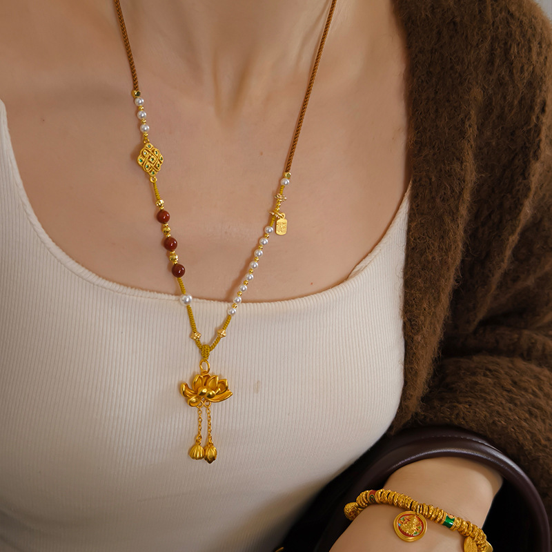 Ethnic Style Sand Gold Necklace Long Autumn and Winter Accessories Women's Light Luxury Niche New Chinese Style Lotus Pendant Necklace Jewelry