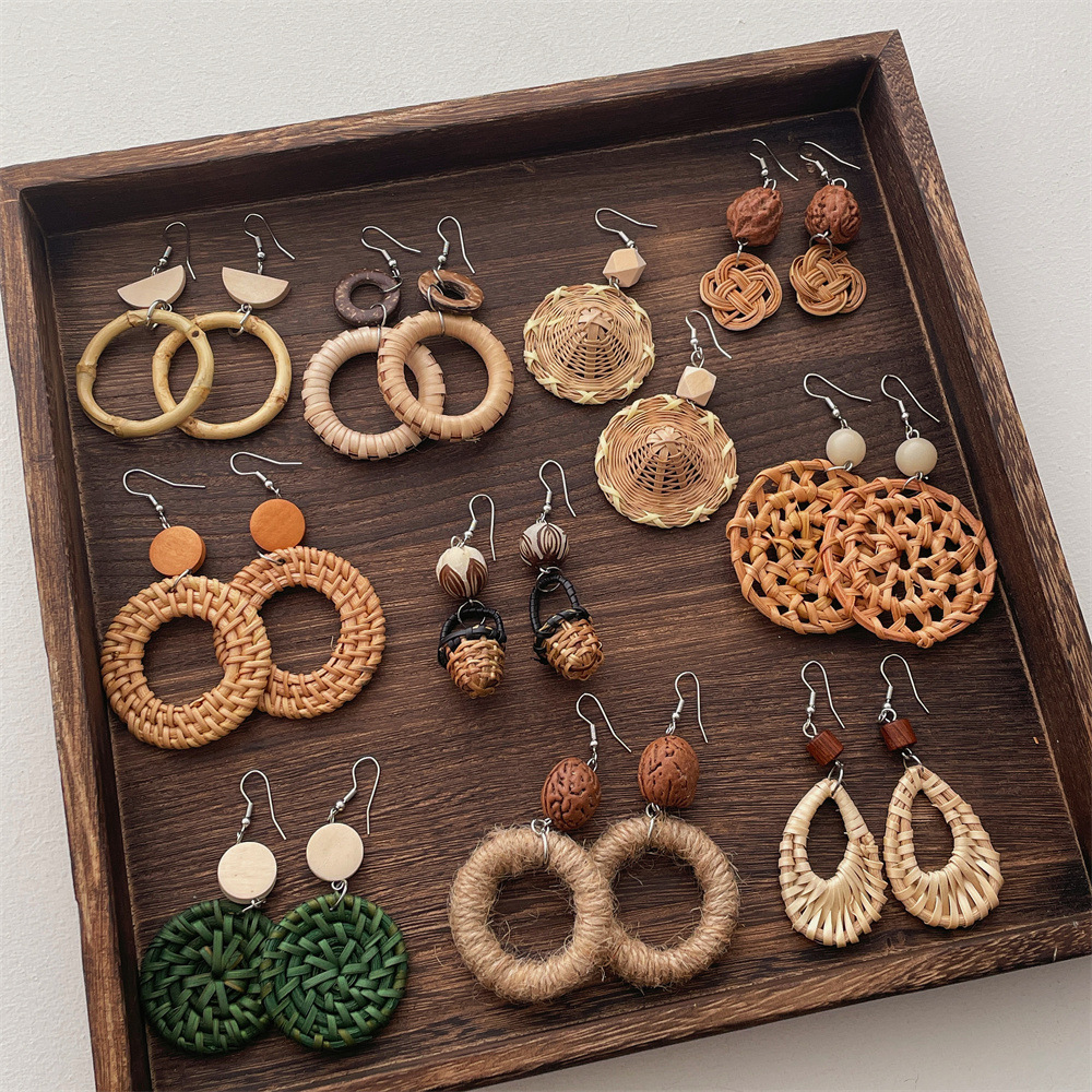 Vintage Mori Grass Rattan Woven Handmade Earrings Bohemian Holiday Ear Studs Women's Ethnic Style Summer Ear Jewelry