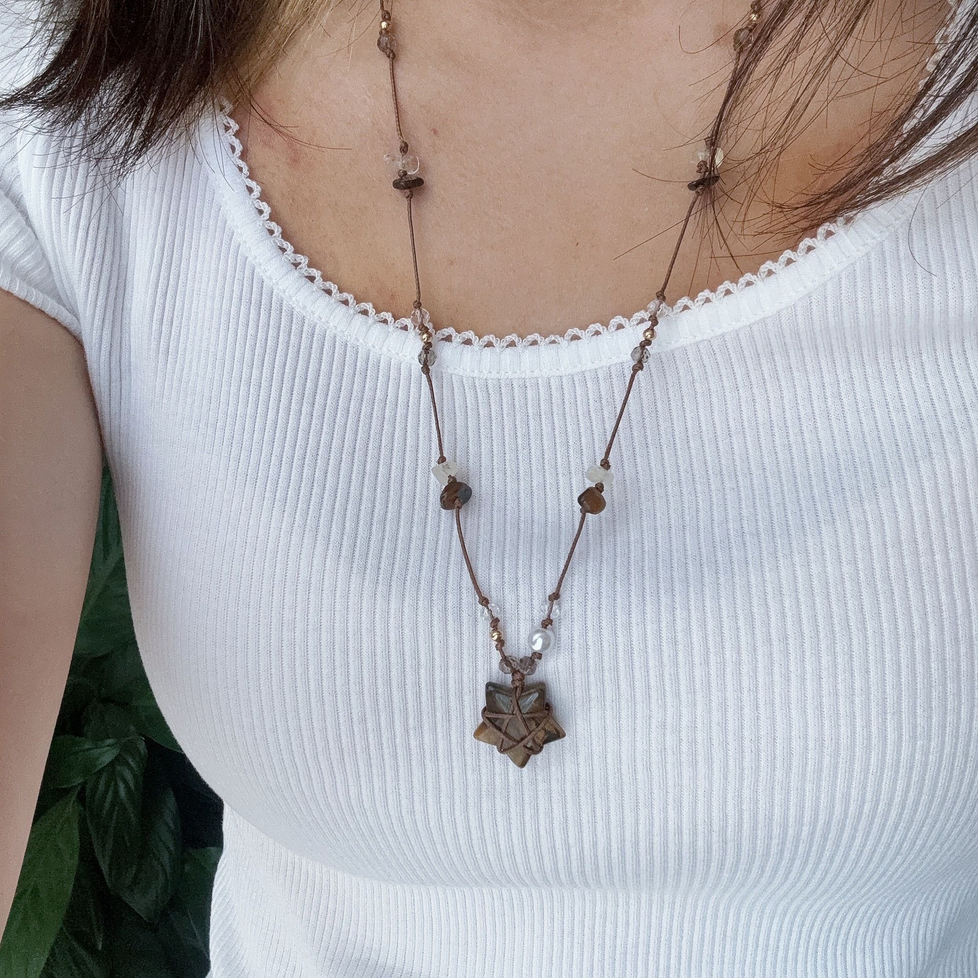 Braided Tiger Eye Stone Star Pendant Necklace, Vintage Ethnic Style Sweater Chain, Niche Design, Fashionable Accessory, Versatile