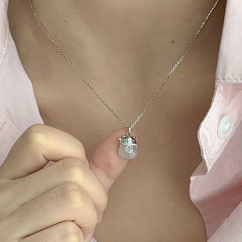 925 Sterling Silver Diamond-Encrusted Lucky Cat and Blessing Chalcedony Necklace for Women, Simple Niche Design, Exquisite Clavicle Chain 0129A