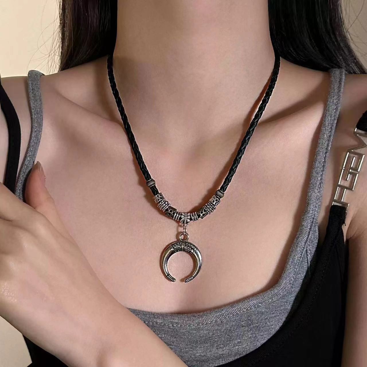 European and American Retro Ethnic Style Woven Crescent Horn Pendant Necklace Simple Niche High-grade Clavicle Chain Jewelry