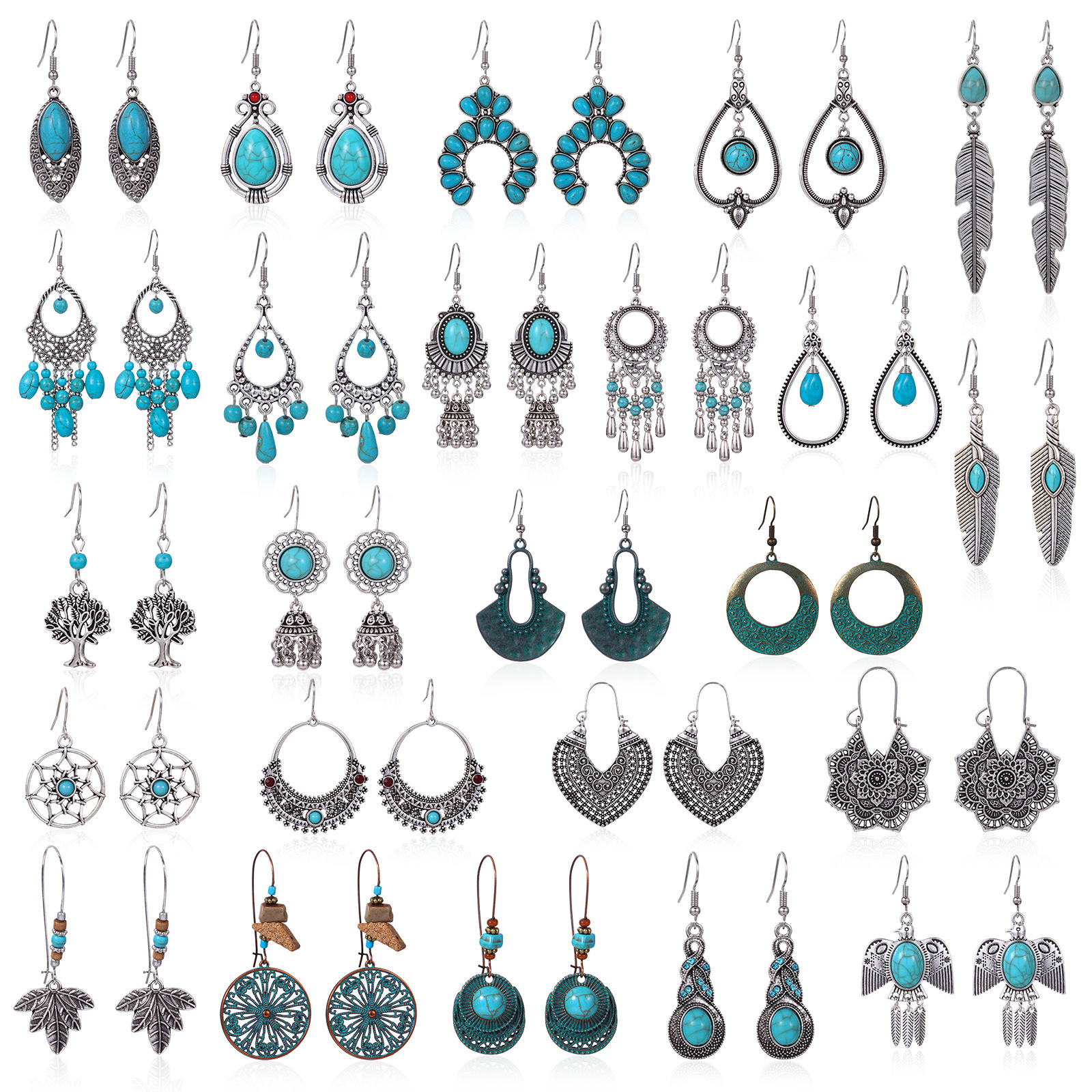 Amazon Cross-Border Bohemian Ethnic Style Earrings Turquoise Geometric Hollow Tassel Earrings for Women