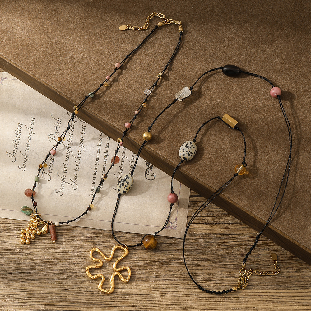 2025 Retro Hand-Woven Rope Beaded Titanium Steel Necklace for Women Niche Design Ethnic Style Sweater Chain Flower Accessories