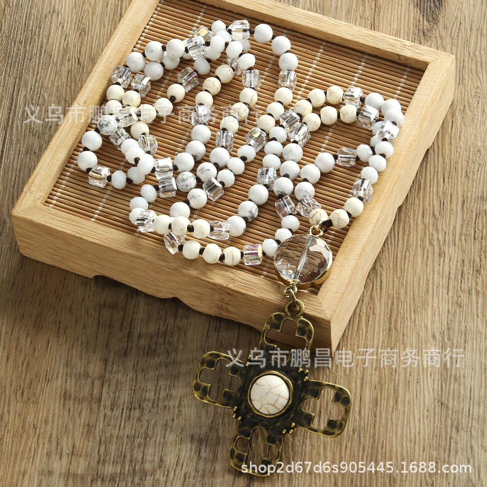 European and American Cross-Border Ethnic Style Ancient Green Cross Pendant Necklace 6mm Natural Stone Glass Knotted Necklace Sweater Chain