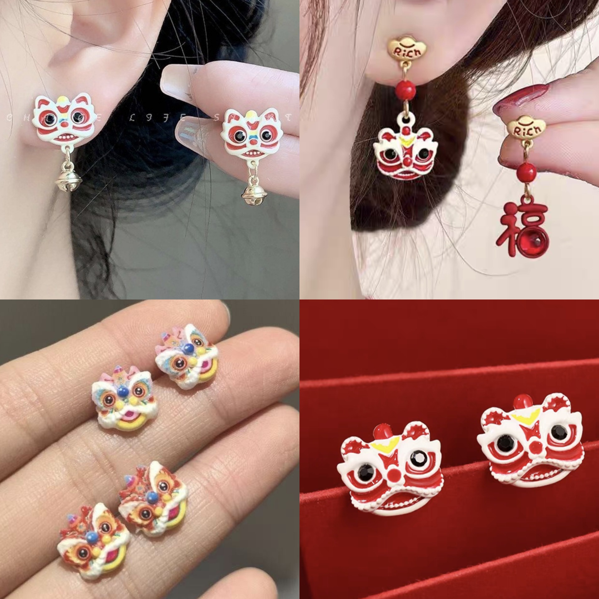 Red Lion Dance Earrings for Women, Festive for the New Year 2024, New Chinese Style National Trend Earrings with 925 Silver Needles, Trendy National Style