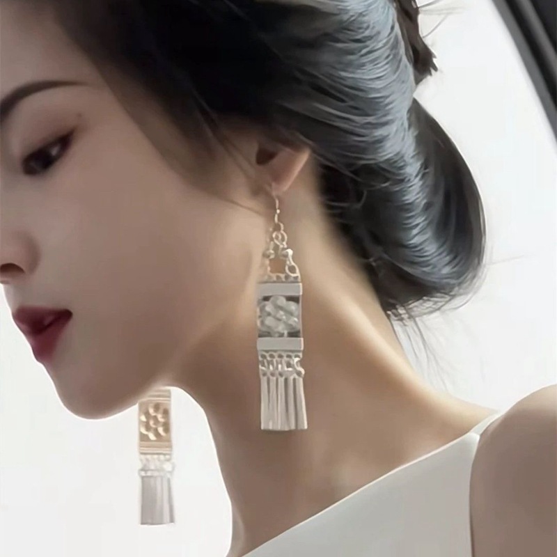 Qing Benjiaru New Chinese-style Beauty Long Imitation Miao Silver Ethnic Earrings High-end National Style Tassel Ear Clip