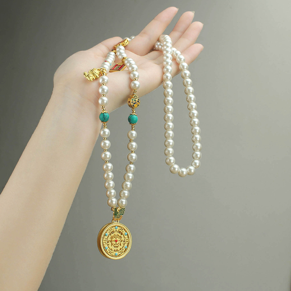 New Chinese-Style Long Ethnic Necklace with Handmade Beaded Pearls, Sweater Chain, Alloy Compass Pendant, and Cheongsam Accessory