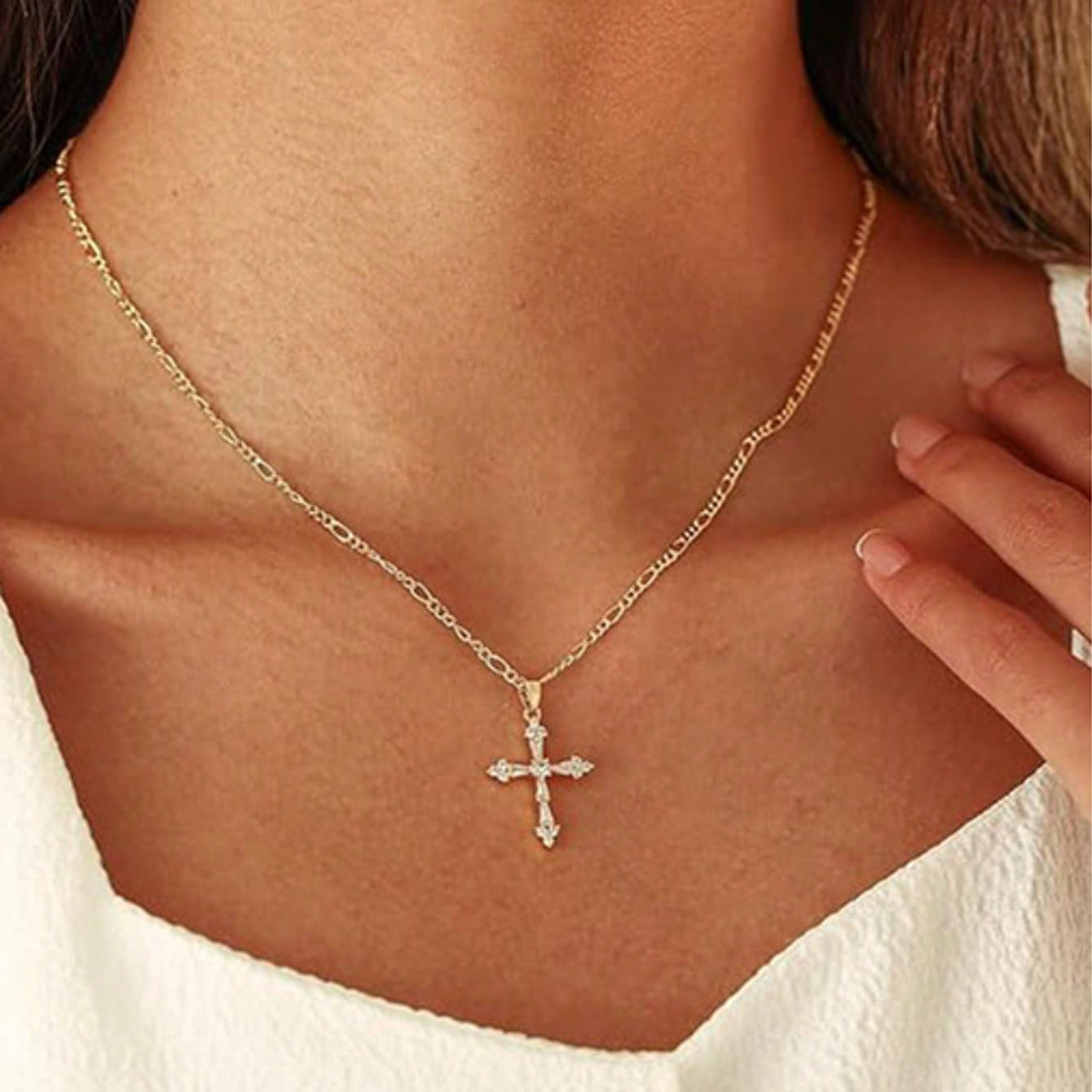 Amazon Fashion Cubic Zirconia Cross Pendant Clavicle Chain Gold Box Chain Necklace