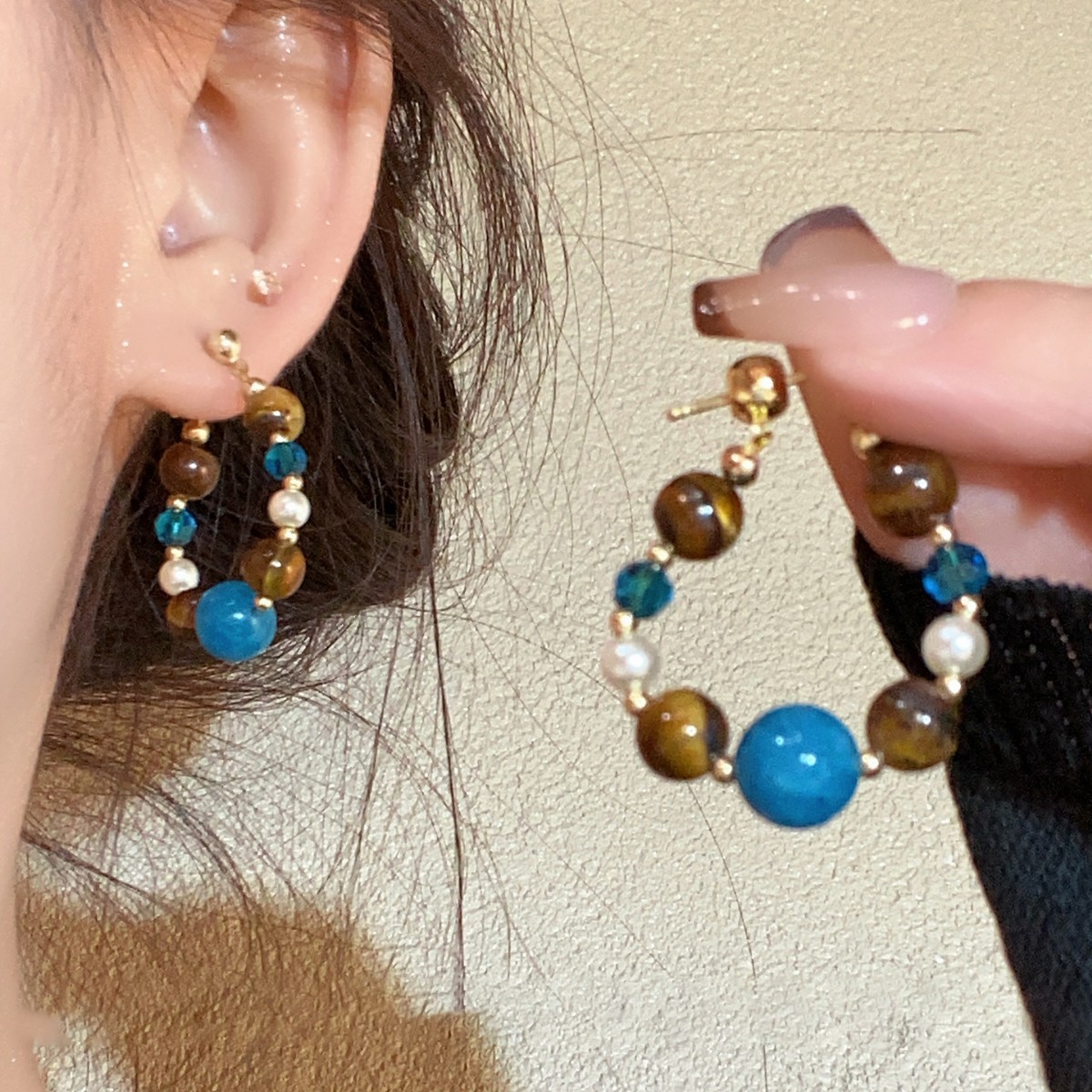 2025 New Retro Maillard Tiger Eye Stone Beaded Earrings Women's Light Luxury High-End Earrings Ethnic Style Earrings