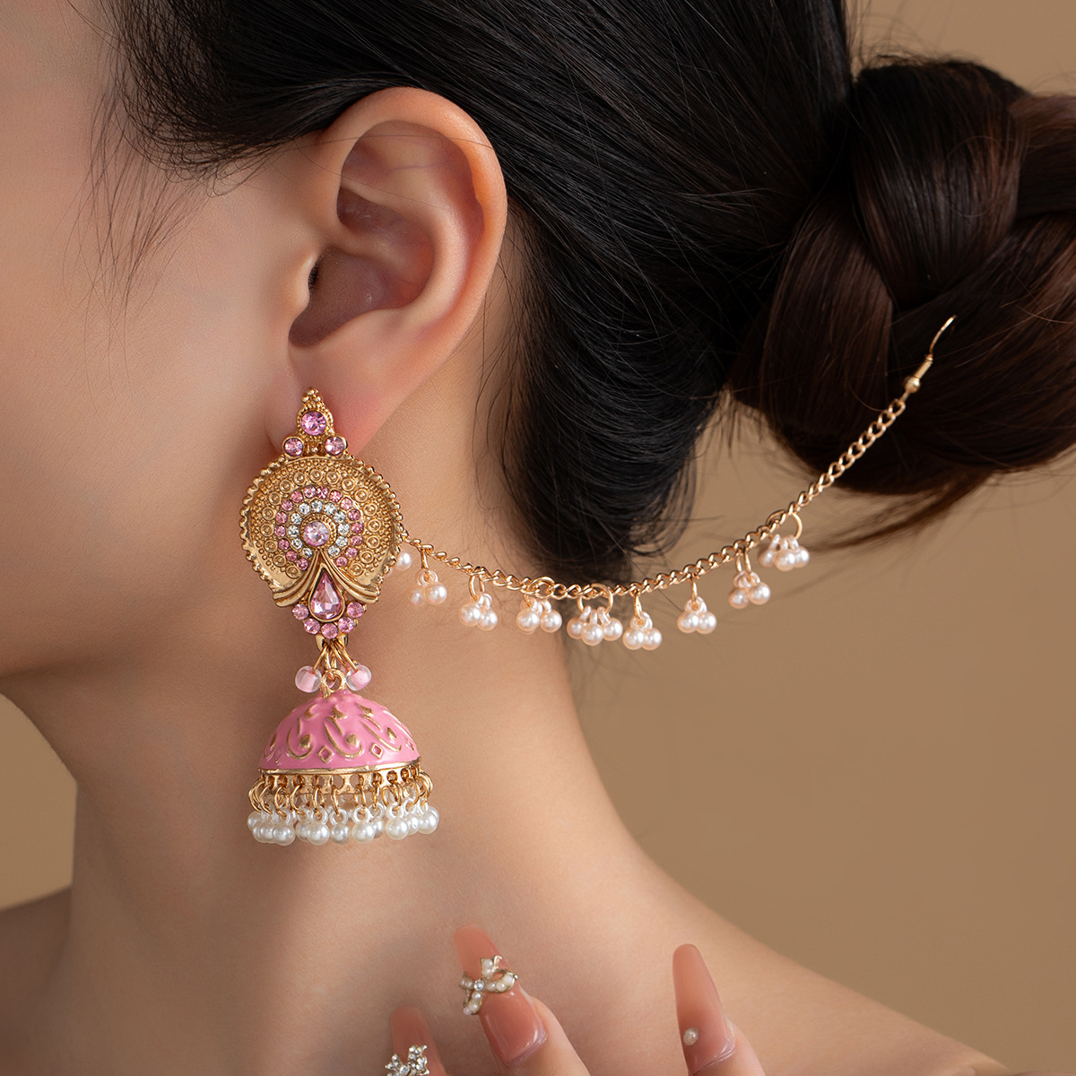 Indian Style Exaggerated Rhinestone Pearl Bell Tassel Earrings Set for Women Colorfulful Handmade Traditional Ethnic Style Earrings