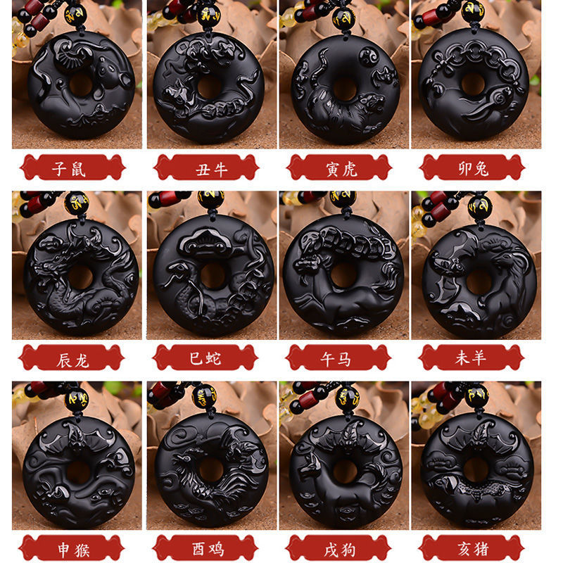 Obsidian 12 Zodiac Rat Cattle Rabbit Dragon Snake Horse Sheep Monkey Chicken Dog Pig Jade Pendant Necklace Men and Women Yu Pei Zodiac