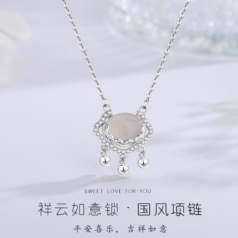 S999 Pure Silver Peace and Good Fortune Lock Necklace, Pure Silver Chalcedony Longevity Clavicle Chain, Versatile National Style Silver Jewelry
