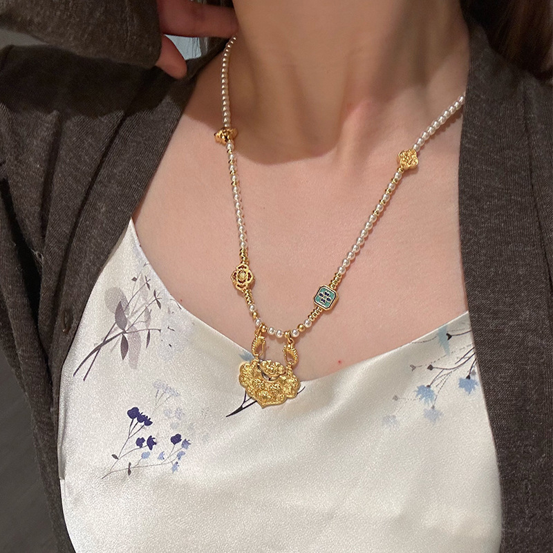 New Chinese Style Ancient Sha Gold Koi Duobao Ping An Ruyi Lock Pendant Pearl Necklace Women's New Guofeng Clavicle Chain