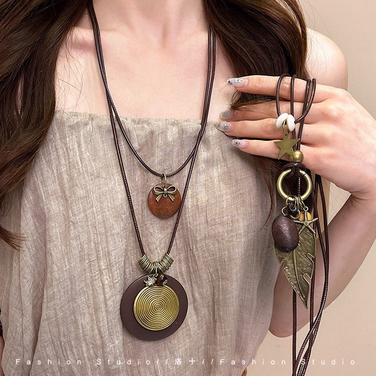 New Chinese Zen Style Long Sweater Necklace Women's Double-Layer Retro Ethnic Style Beaded Necklace Niche Feather Clavicle Chain