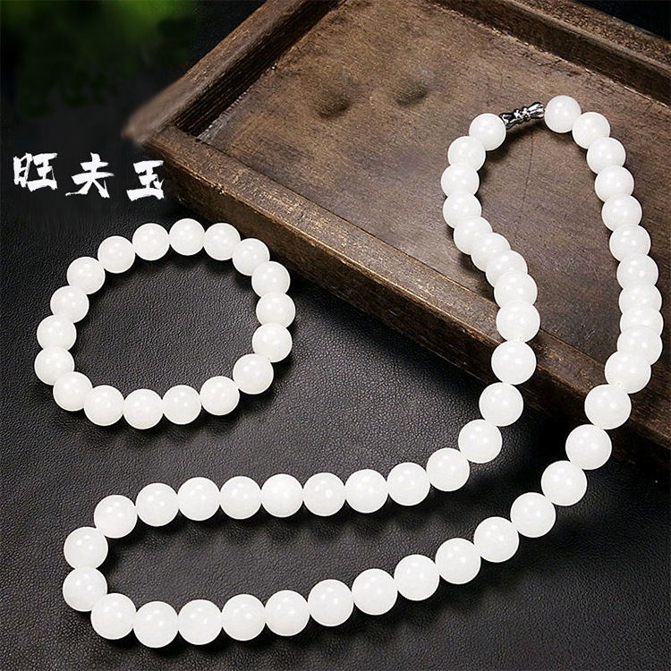 White Jade Necklace Women's 8mm Imitation Hetian Jade Round Bead Necklace White Jade Bracelet Elegant Bracelet Ethnic Style for Mother