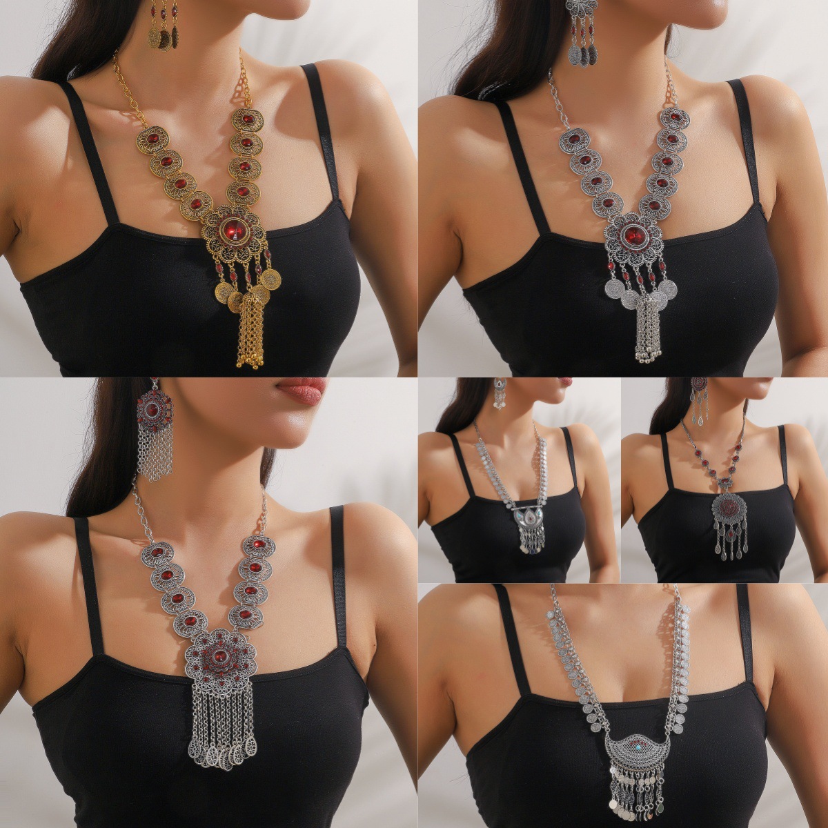 European and American fashion retro national style personality exaggerated Bohemian geometric tassel necklace stud earrings suit