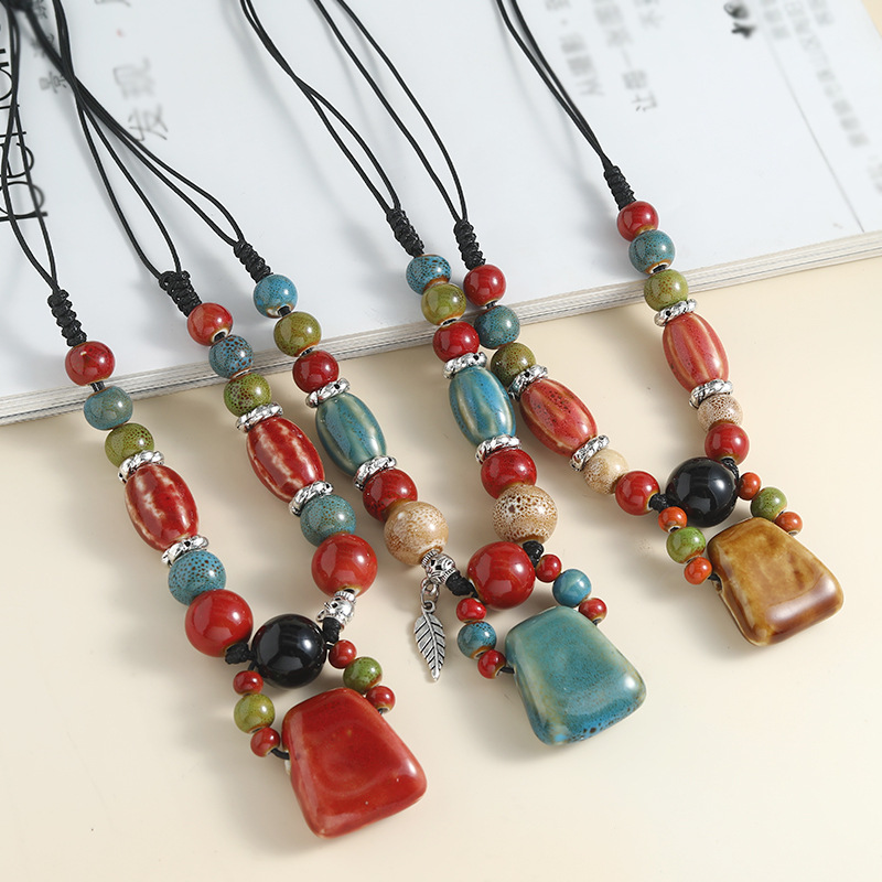 Bohemian Retro Ceramic Beaded Necklace Colorfulful Ax Bean Pendant Ethnic Style Long Simple Sweater Chain