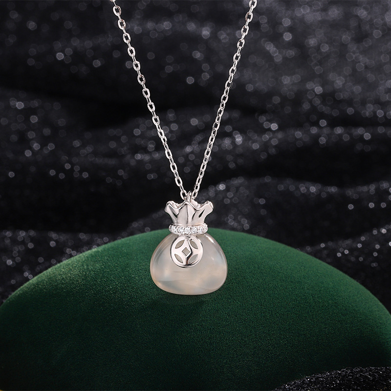 Di Feng S999 Pure Silver Transfer Lucky Bag Necklace White Chalcedony Pendant Women's Popular Valentine's Day Light Luxury Niche Clavicle Chain