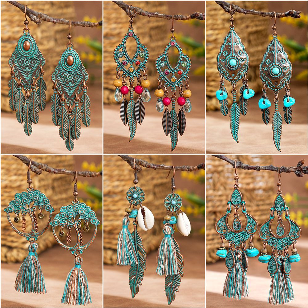 European and American Creative New Ethnic Style Earrings Vintage Alloy Plated Ancient Silver Diamond Turquoise Geometric Pendant Earrings for Women
