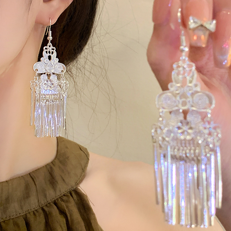 Ethnic style silver flower wind chime tassel earrings European and American temperament fashion ear hook niche personality high-end earrings