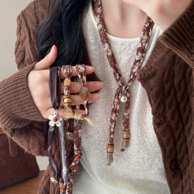 Love Beaded Pendant Silk Scarf Necklace Women's Retro Ethnic Style High-End Sweater Chain Decorative Halter Accessories