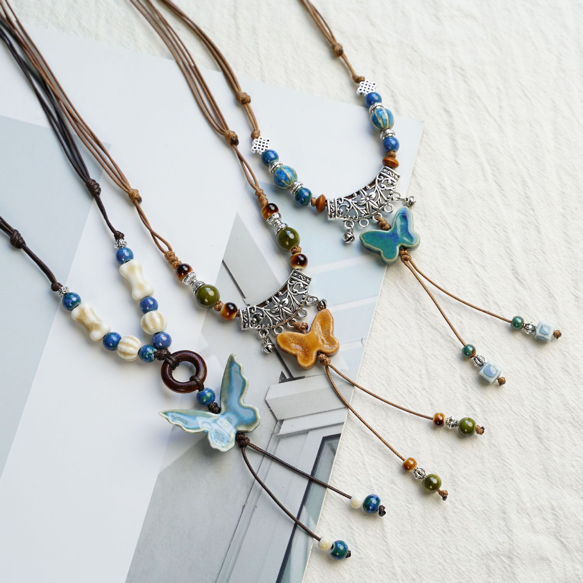 Jingdezhen Ceramic Butterfly Braided Rope Pendant Necklace Retro Ethnic Style Sweater Chain Niche Design Versatile Necklace