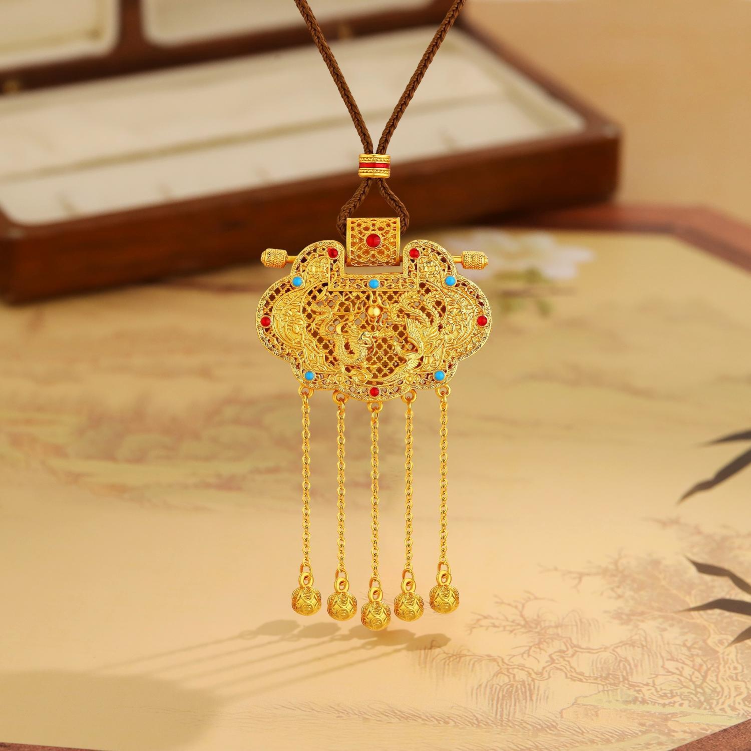 Dragon and Phoenix Lock Bag Braided Rope Necklace for Women with Filigree Inlay Design, High-End Elegant Light Luxury Sweater Chain