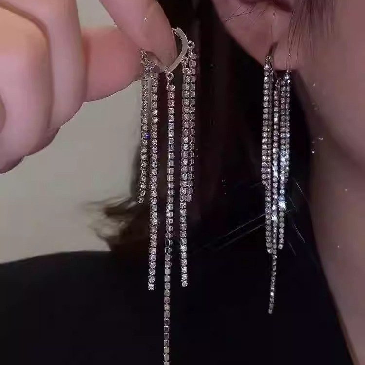 South Korea Dongdaemun Fashion Long Tassel Diamond Ear Buckle High-end Elegant Elegant Earrings Women's Unique All-match Ear Trendy