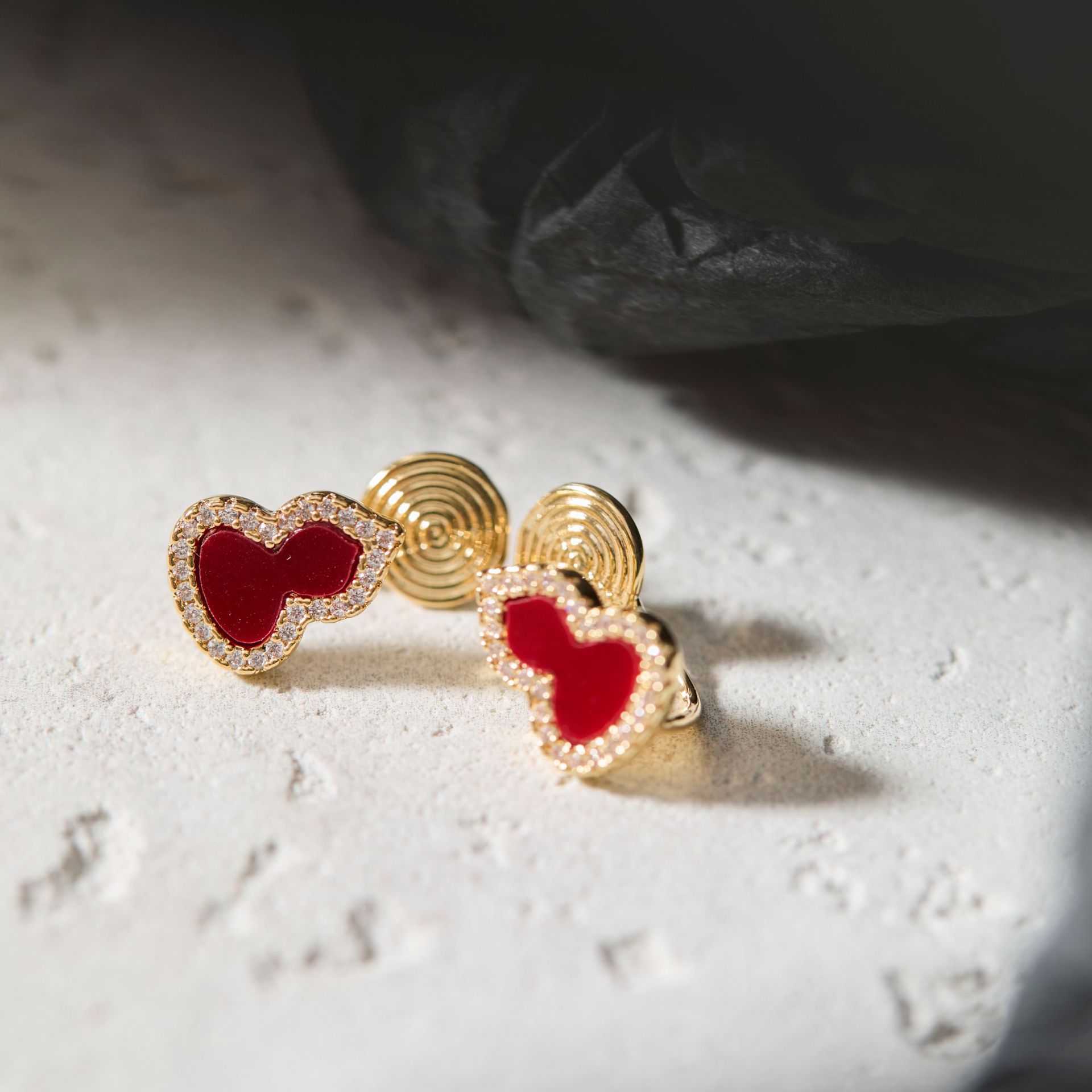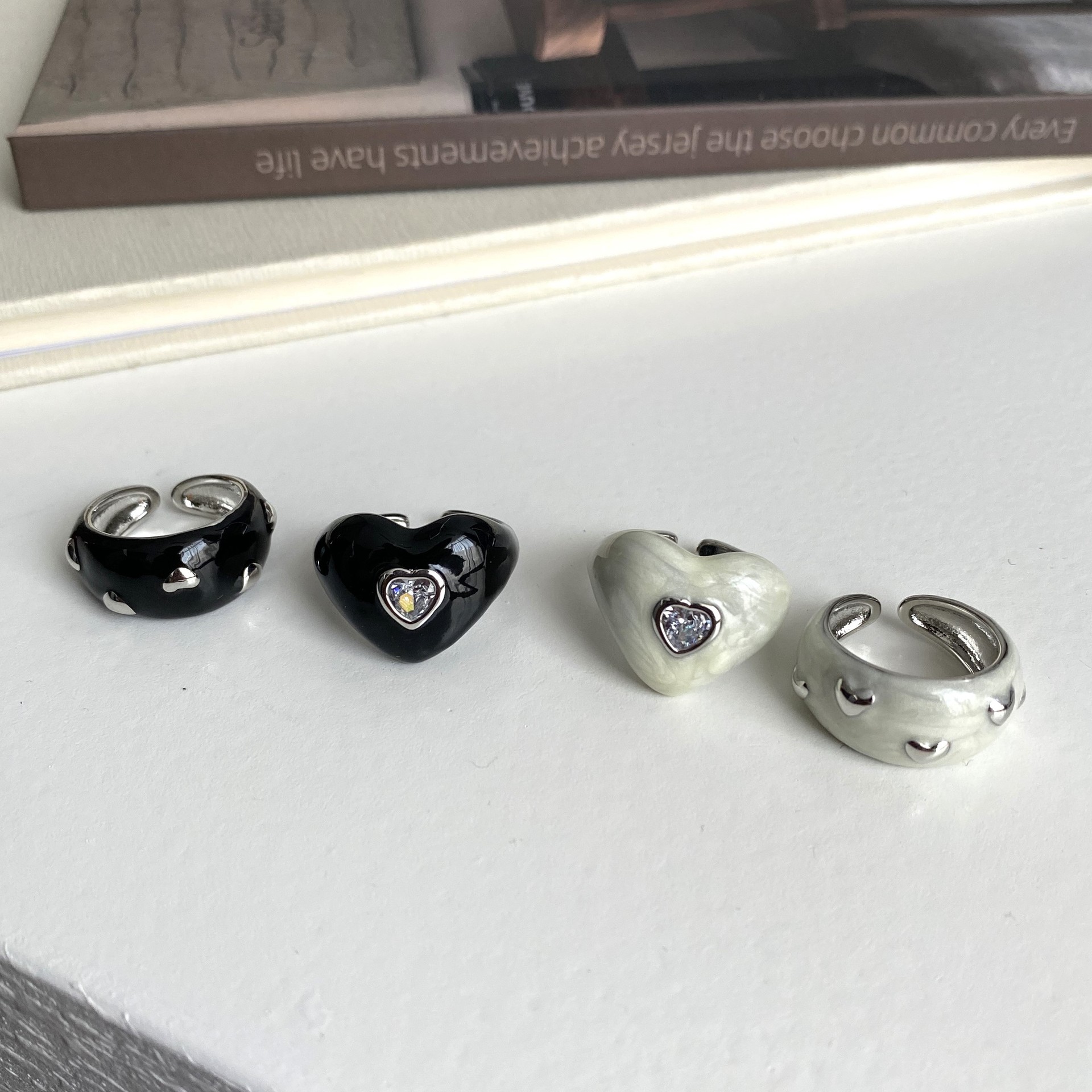 Korean Blogger's Same Style Dripping Glaze Ring Heart Black Pearlescent White Design Cute Zircon Inlaid Index Finger Ring