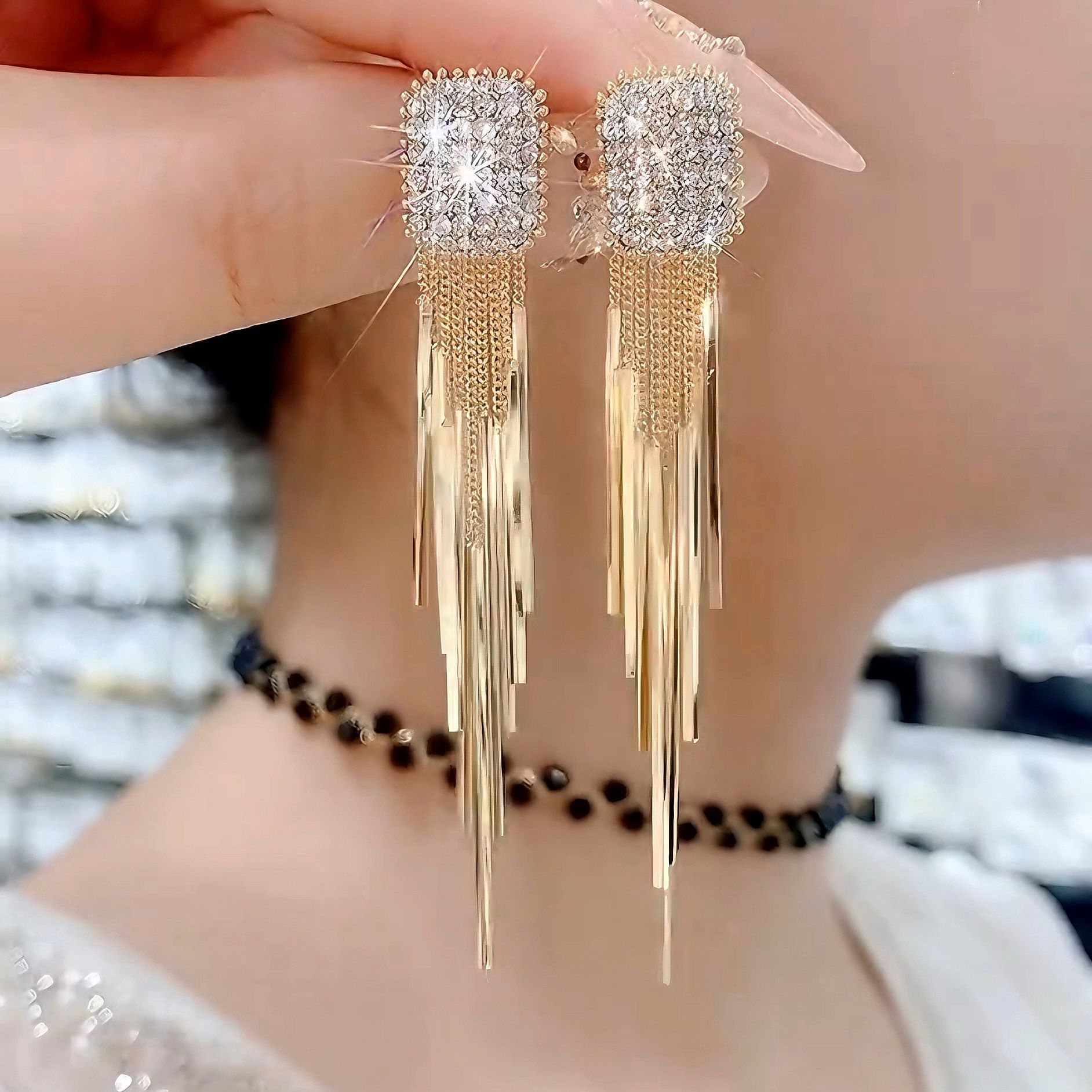 Super Shiny Elegant Long Full Diamond Zircon Tassel Earrings for Women Accessible Luxury Niche Luxury High-End Geometric Earrings Stud Earrings