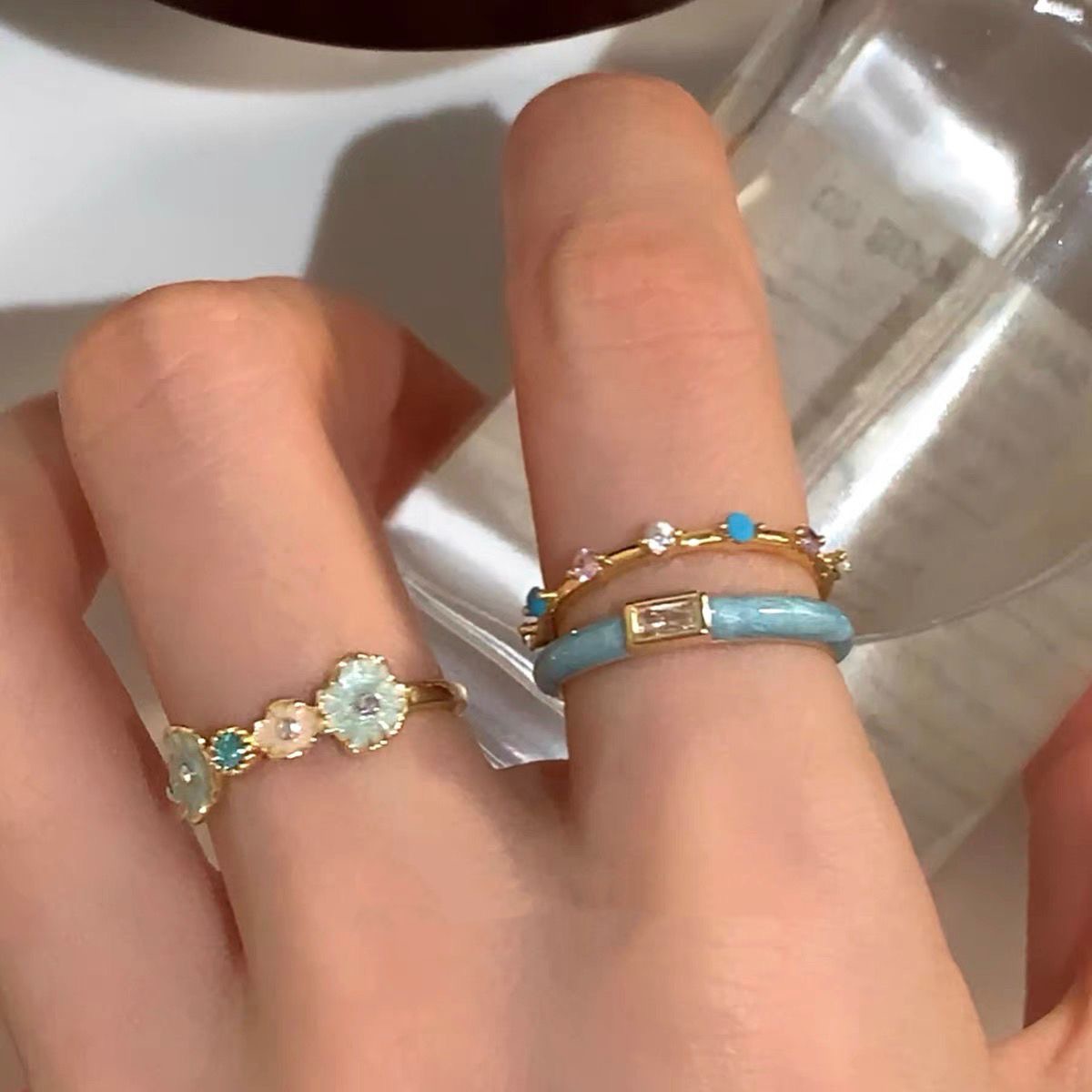 Enamel Blue Oil-Dropped Zircon Flower Open Ring for Women, Light Luxury, High-End, Stackable, Niche Design Index Finger Ring