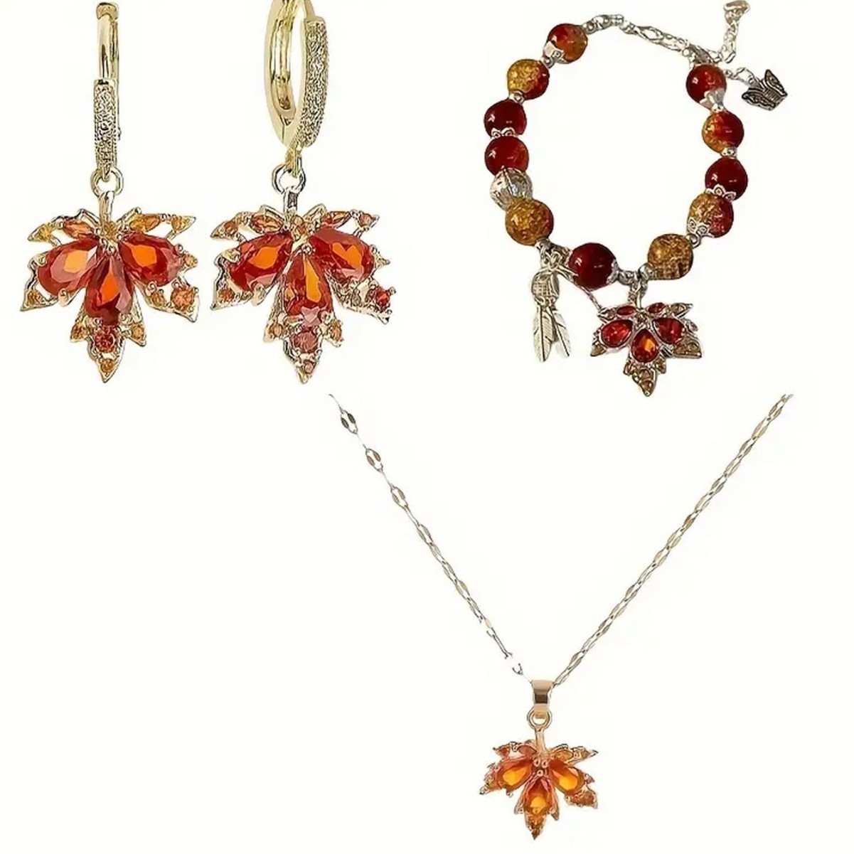 Cross-Border New Maple Leaf Earrings, Fashionable Personality, Super Fairy Niche, Light Luxury Red Earrings, Bracelet and Necklace Set Wholesale