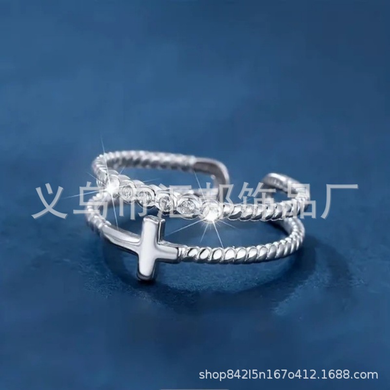 European and American Cut Out Double-Layer Cross Crystal Open Ring Cross-Border Simple Fashion Stylish Trendy Ring