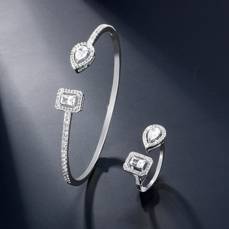 European and American New Style Personality Open Bracelet Ring Two-piece Set Open Full Diamond Water Drops Square Zircon Ring Bracelet