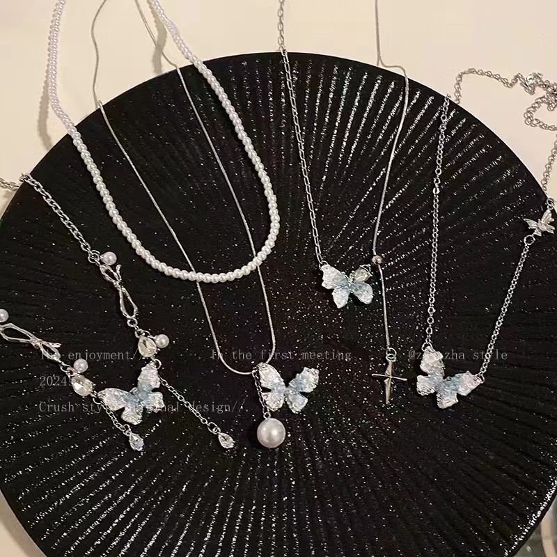 Ice Crystal Gradient Pearl Butterfly Tassel Necklace Women's Summer Exquisite High-end Clavicle Chain Sweet Cool Spice Neck Chain