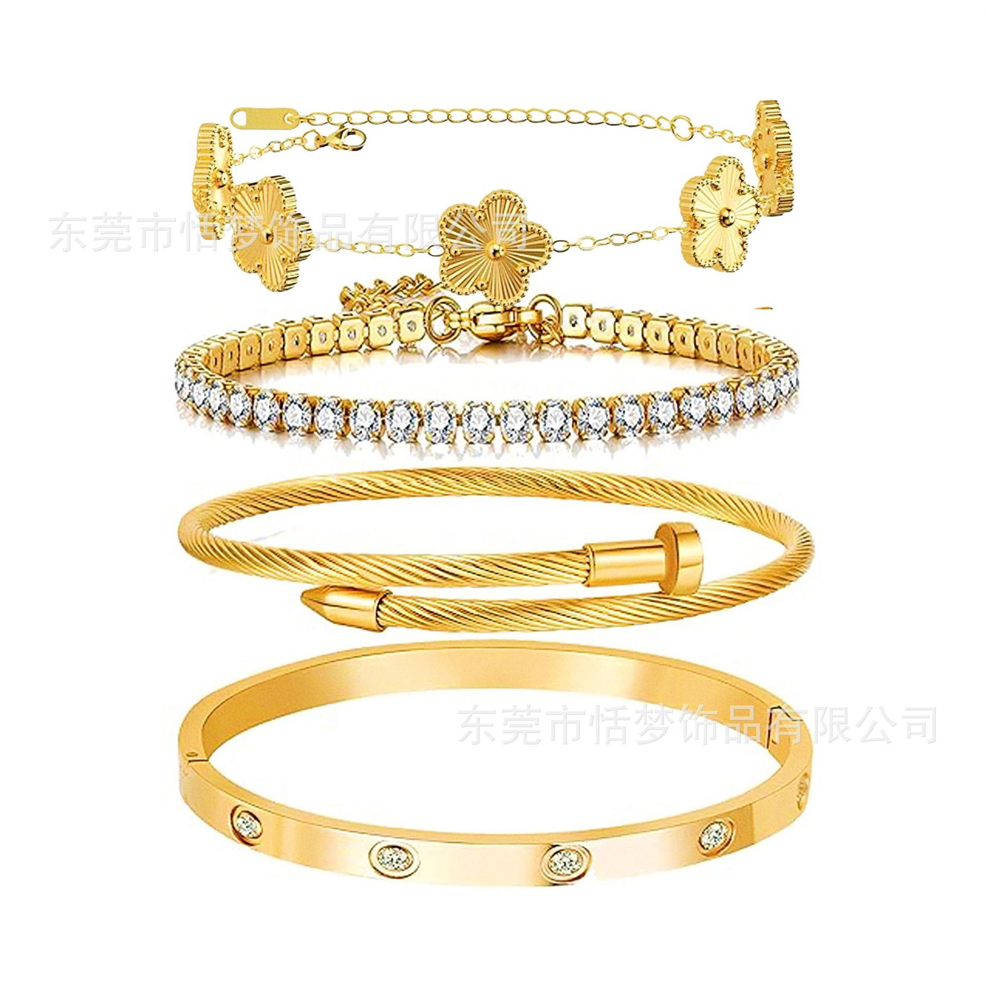 Titanium Steel Five-Leaf Flower Bracelet Titanium Steel Bangle 4-Piece Set Plated with 18K Real Gold Amazon Bestseller Non-Fading Set Wholesale