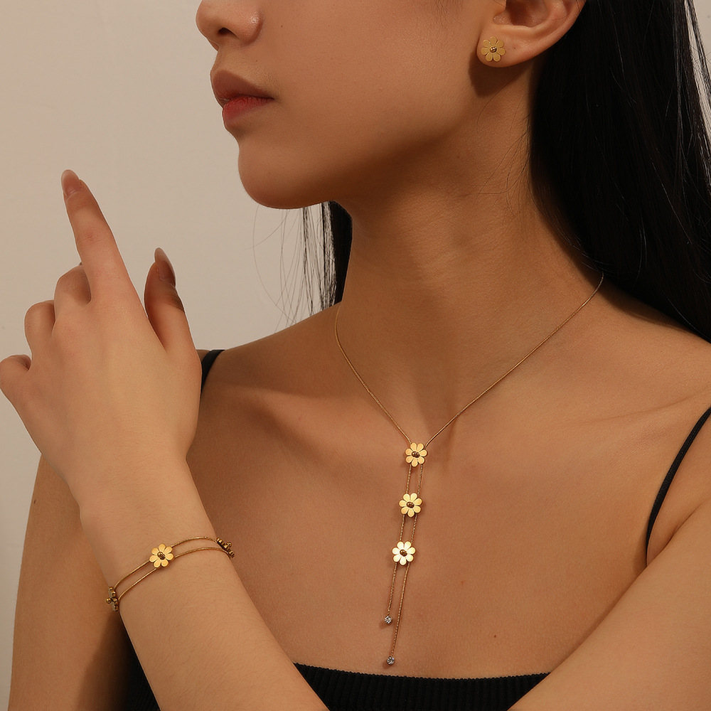 Stainless steel double-layer round snake chain necklace bracelet jewelry cross-border color titanium steel 18k with diamond chrysanthemum jewelry suit