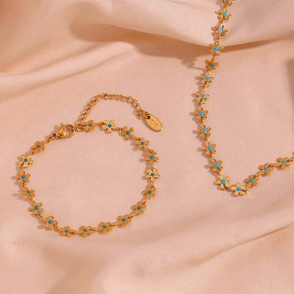 European and American Fashion Personalized Retro Bracelet Set Stainless Steel Plated 18K Blue Oil Dripping Flower Handmade Chain Necklace for Women
