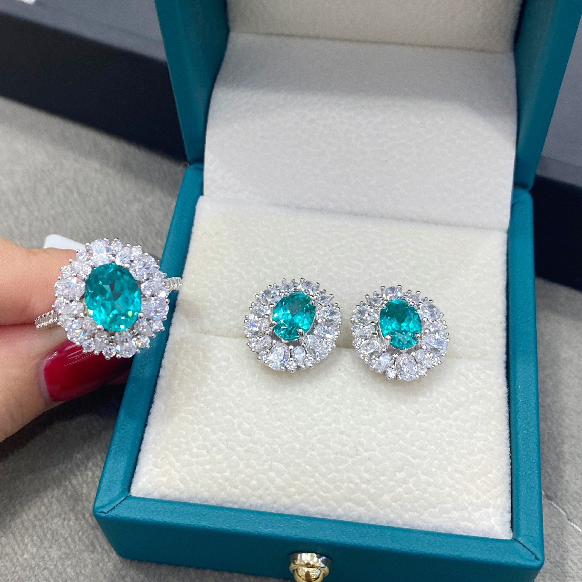 925 Silver Plated 18K Gold Inlaid Cultured Paraiba Ring High-End Earrings Set Xiaohongshu Live Supply