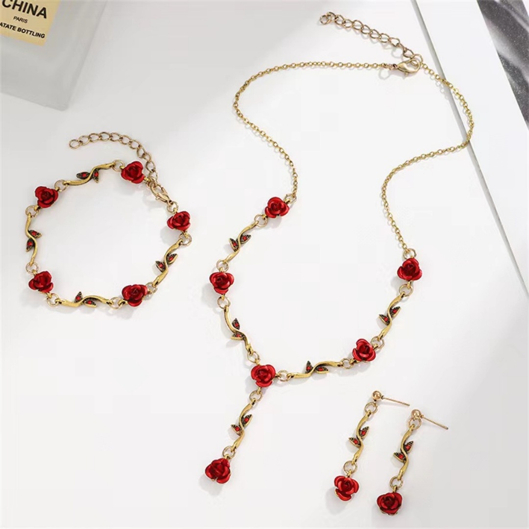 French Girl Mori Rose Earrings Vintage Romantic Red Flower Bracelet Niche Design Sense Necklace suit