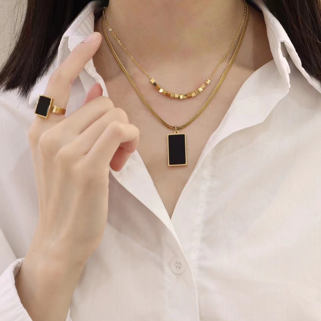 Titanium Steel Necklace Ten Square Black Black Brand Double Layer Overlapping Clavicle Chain Elegant All-match Necklace Three-piece Set Live Same Style