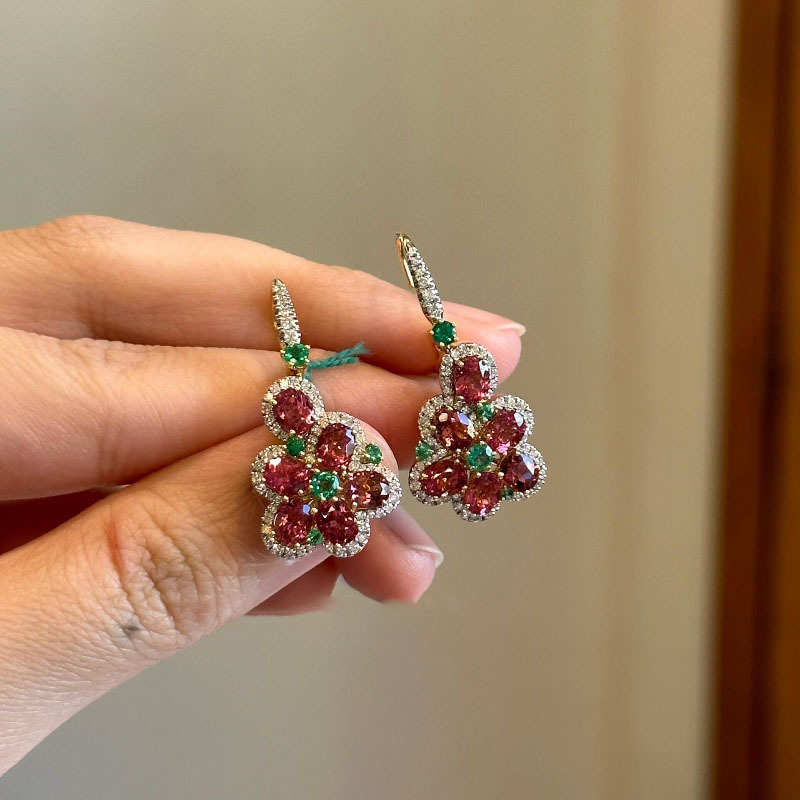 Light Luxury Vintage Pomegranate Green Diamond Flower Ear Buckle Ring Small and Exquisite Micro-inlaid Zircon Elegant Sweet suit Jewelry