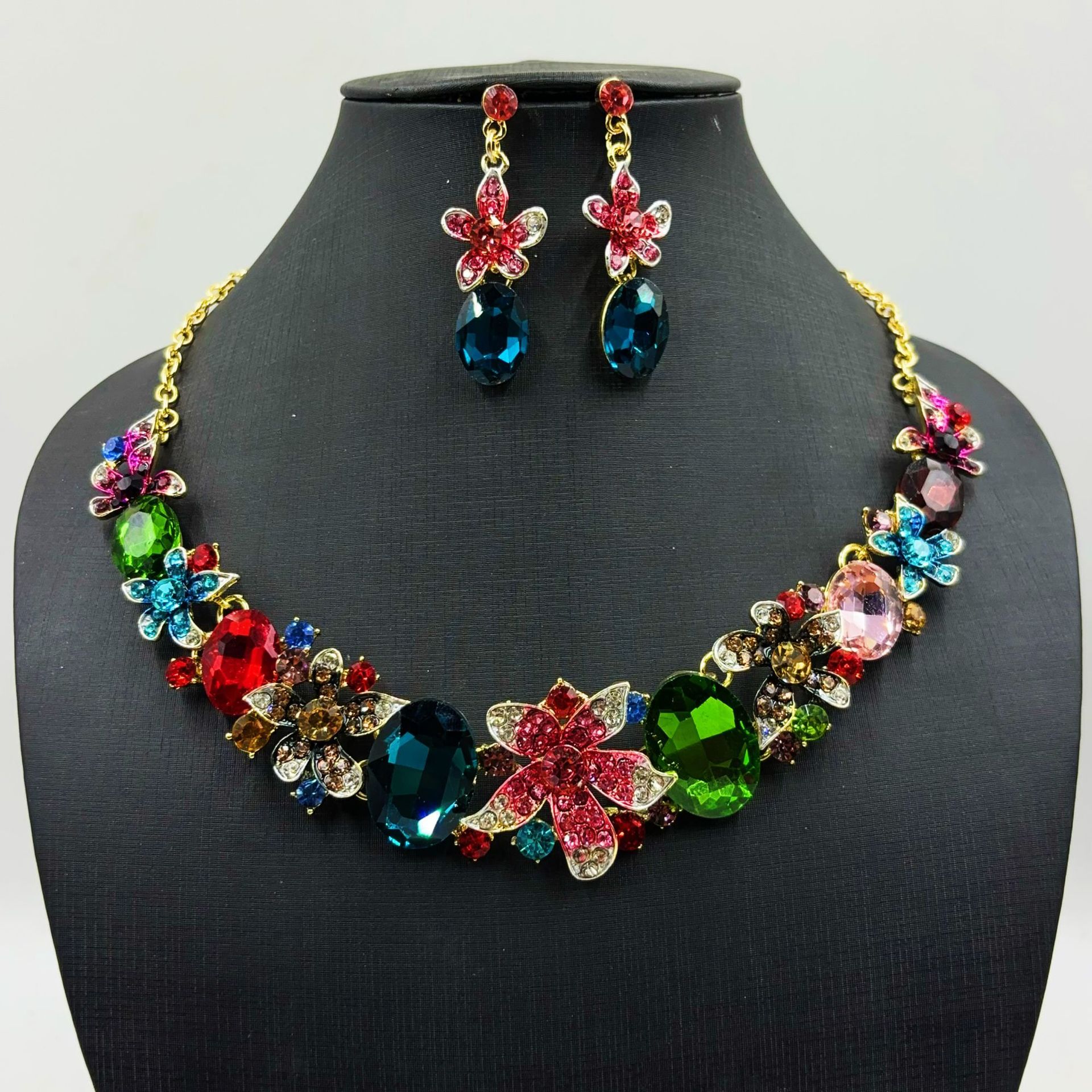 Amazon new European and American flower necklace earrings two-piece set exaggerated retro crystal color banquet jewelry suit