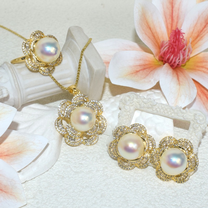 Live Hot Sale Light Luxury Exquisite Double-layer Flowers Brocade Pearl suit Elegant Earrings Pendant Ring Supply Wholesale