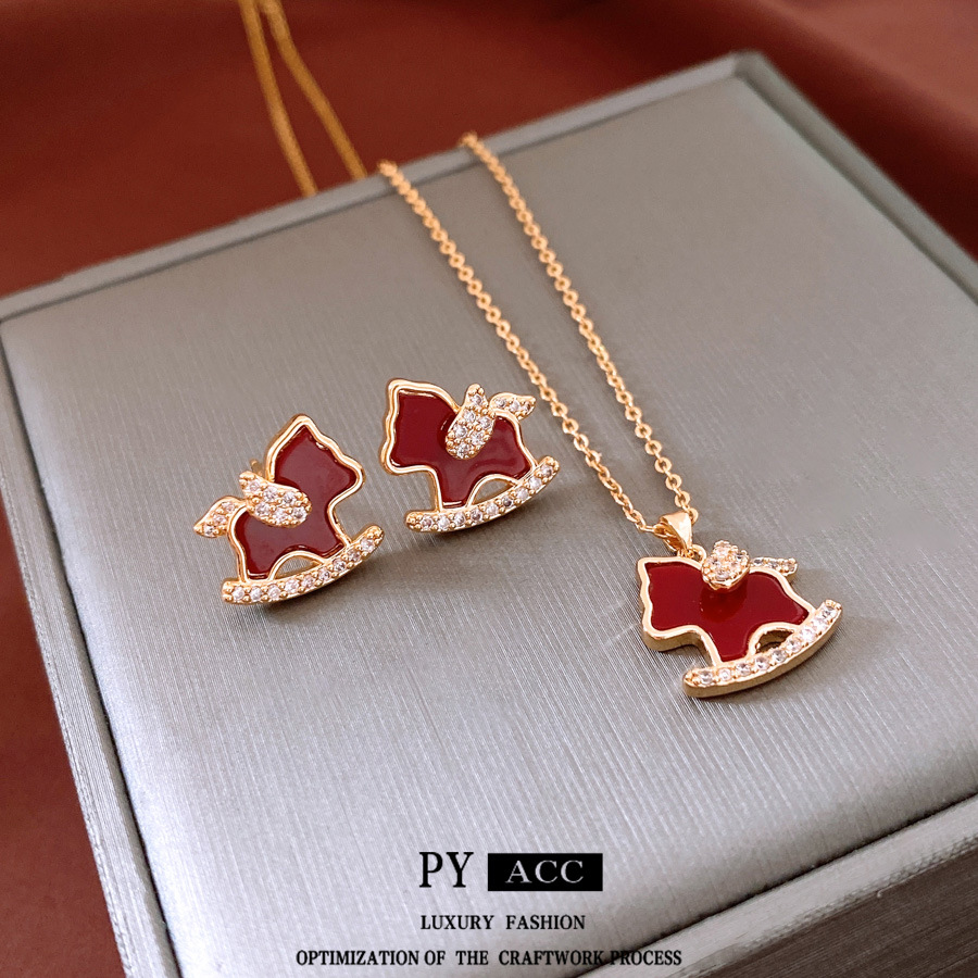 18K Real Gold Electroplated Silver Needle Pony Earrings Necklace Zodiac Year Red Sweater Chain Vintage Versatile Jewelry Set