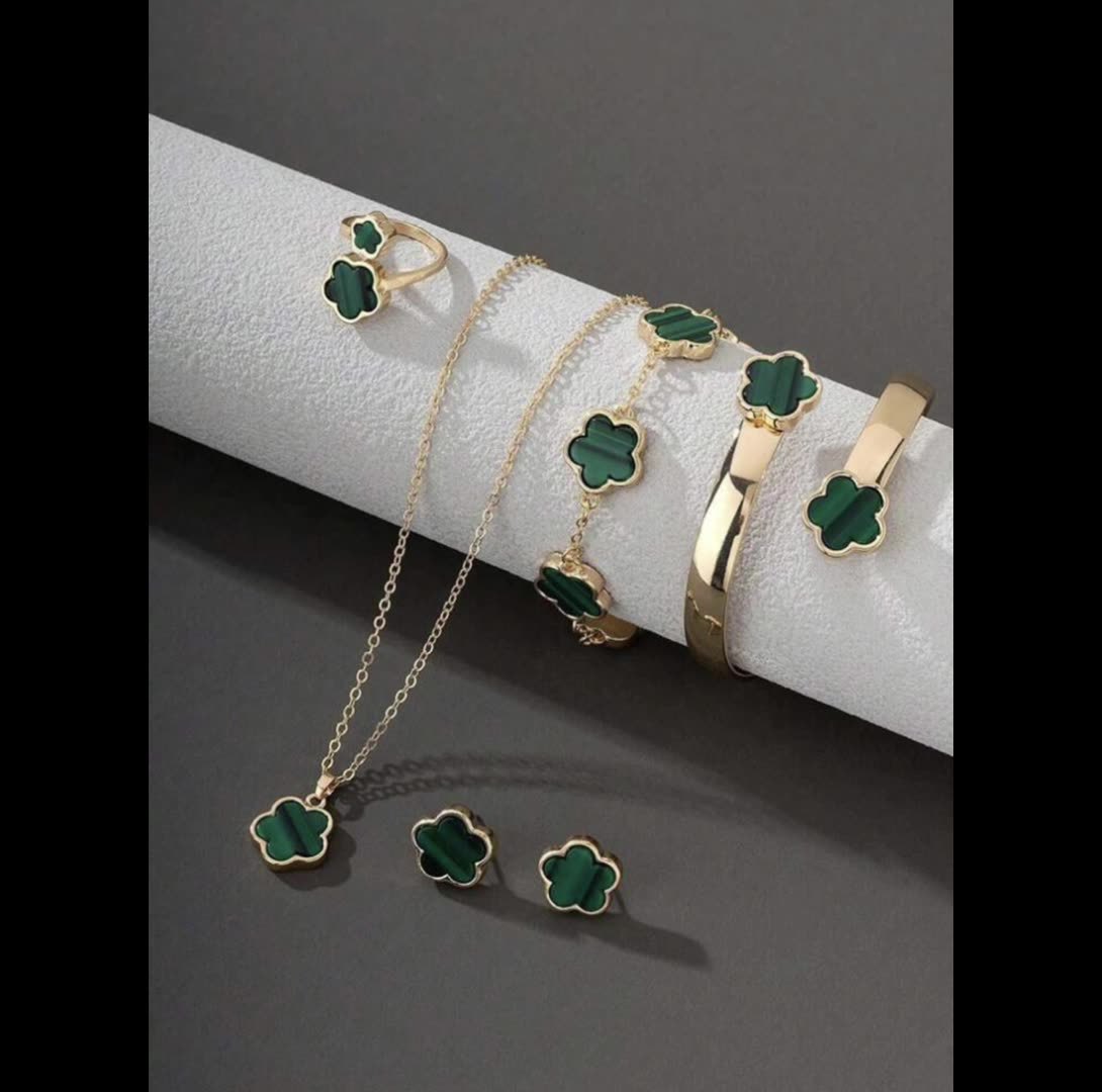 Lucky Four-Leaf Clover Bracelet, Five-Leaf Clover Necklace, Bracelet, Earrings, Ring, Flower Set, 18K Electroplated Plant Flower