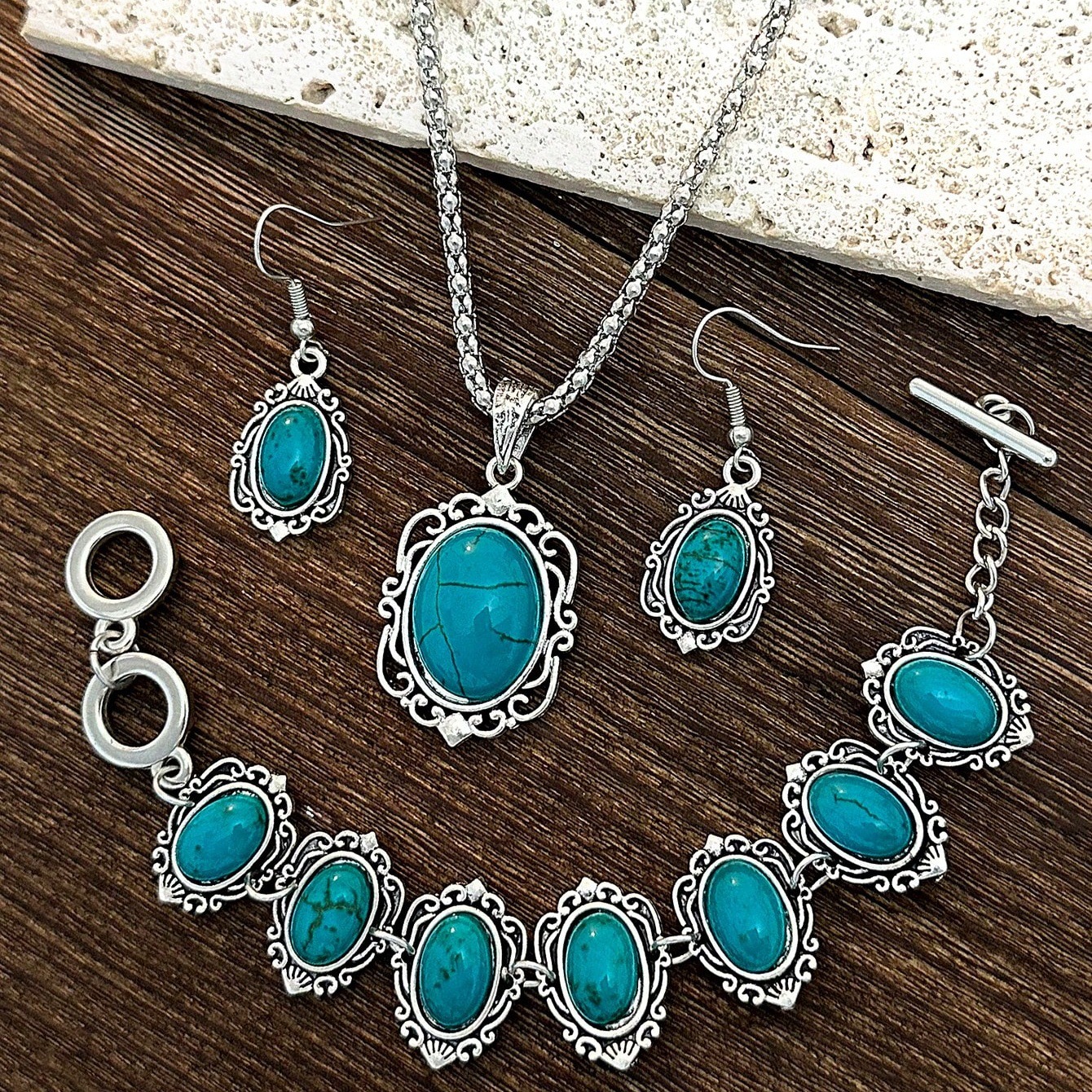 Cross-Border European and American Bohemian Style Fashionable Texture Earrings Temperament Jewelry Turquoise Necklace Earrings Set