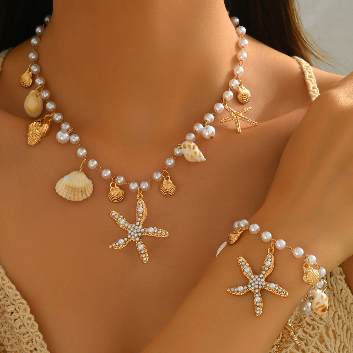 European and American Accessible Luxury Ocean Style Pearl Jewelry Set Metal Style Pearl Conch Scallop Pendant Anklet Necklace Bracelet